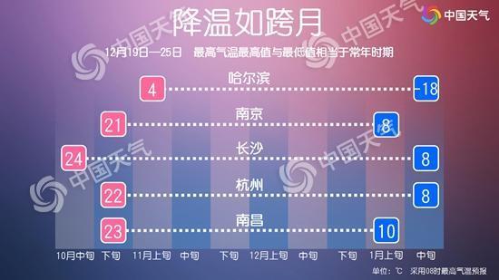 r由于中东部前期偏暖显著,所以此次降温力度大,降温过后各地气温会陆续回落至与常年同期相近的水平。像哈尔滨,最高气温将由今天的4.7℃降至周六的零下11℃,长沙今天最高气温24.2℃,周六则骤降至10℃,冷暖急转。